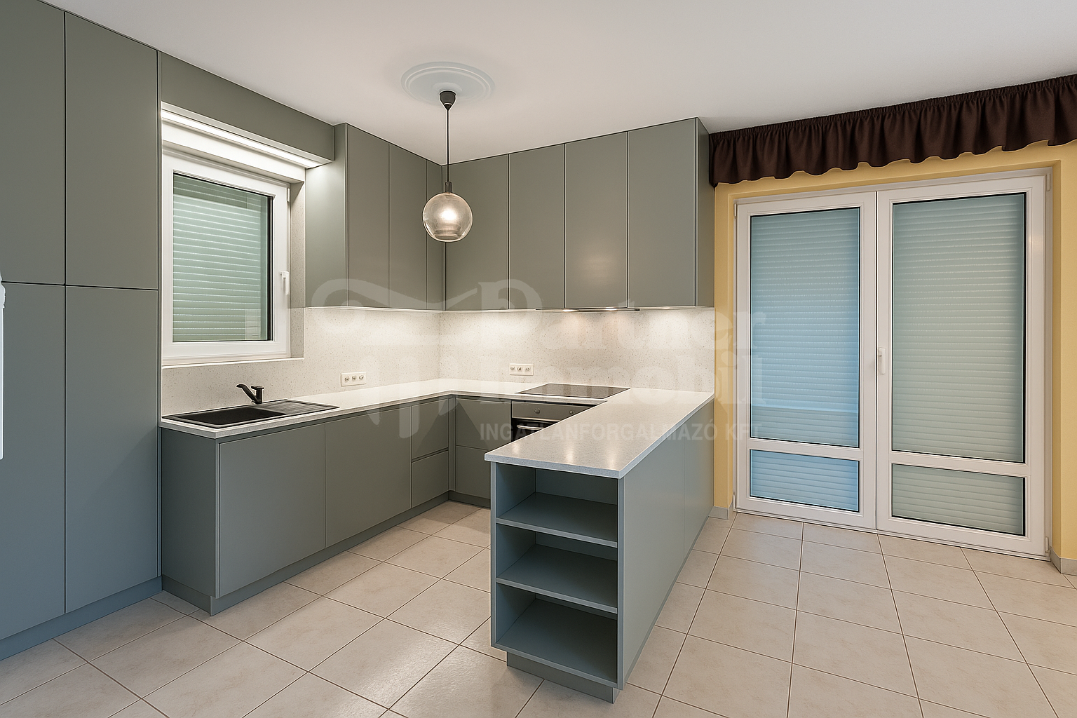 A földszinten kertkapcsolatos étkező, fürdővé alakítható Wc, előszoba gardróbokkal, olasz konyhabútorral felszerelt konyha található.